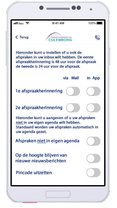 In versie 3.0 is het ook mogelijk om pushnotificaties voor nieuwsberichten aan/uit te zetten. Wil men de afspraak niet in de eigen agenda dan is dat mogelijk. Het is ook mogelijk om een nieuwe pincode in te stellen en de pincode weer te resetten.